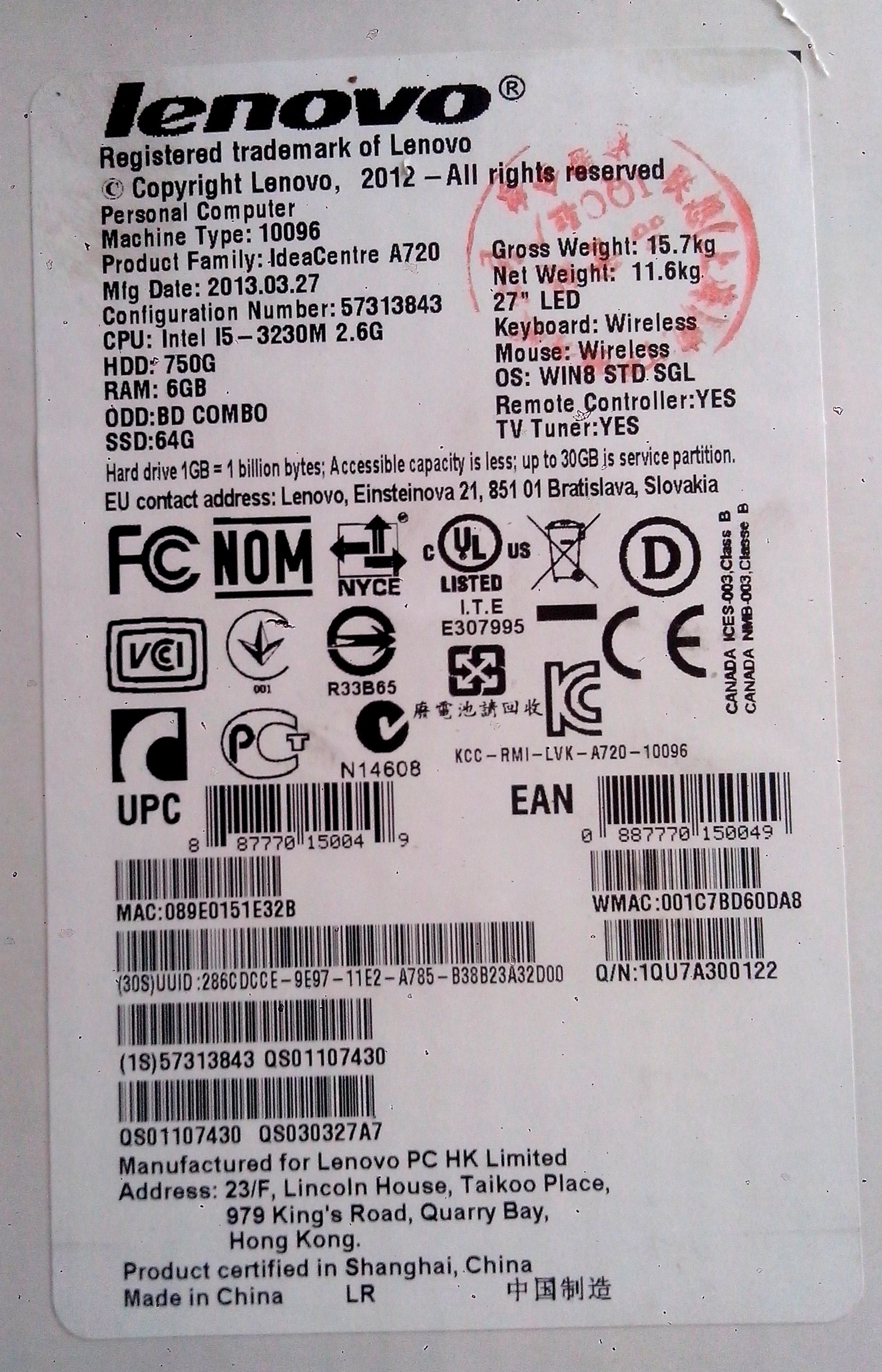 Intel Core i5 2600 MHz (3230M); 6144Mb DDR3-1600MHz; 64Gb, SSD; 27" LED FULL HD (1920x1080) TouchScreen Зеркальный, стекло; nVidia GeForce GT 630M, DDR3 2048Mb, Intel HD Graphics 4000 из ОЗУ; Bluetooth 4.0, Camera (1.3), WiFi (802.11b/g/n); 2xUSB 2.0, 2xUSB 3.0, HDMI, HDMI Input, Line-out/выход для наушников, Microphone in + 1 встроенный микрофон, TV-Tuner; Card Reader 6-в-1 (SD/SDHC/SDXC/MMC/MS/MS Pro); 1 год гарантия производителя