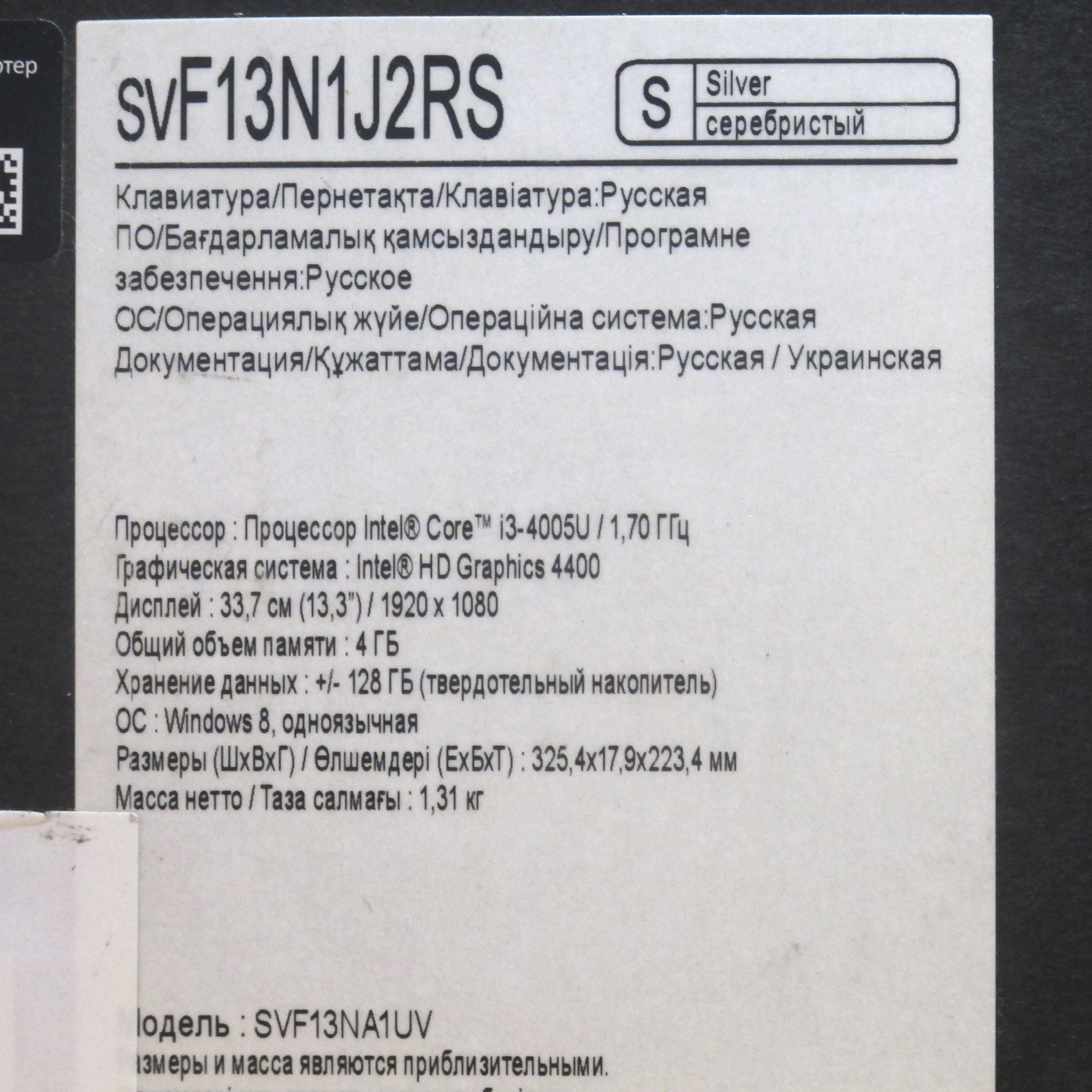 Intel Core i3 1700 MHz (4005U); 4096Mb DDR3L-1600MHz; 128Gb, SSD; 13.3" LED (1920x1080) FULL HD, TouchScreen Зеркальный, стекло; Intel HD Graphics 4400 из ОЗУ; Bluetooth 4.0 + HS, Camera (8.0) тыловая и (0.92) Exmor R фронтальная, NFC, WiFi (802.11b/g/n); 2xUSB 3.0 (USB с возможностью подзарядки), HDMI, Line-out/Microphone in - combo, Microphone (встроенный); Card Reader 1-в-1 (microSD); 2 года гарантия производителя