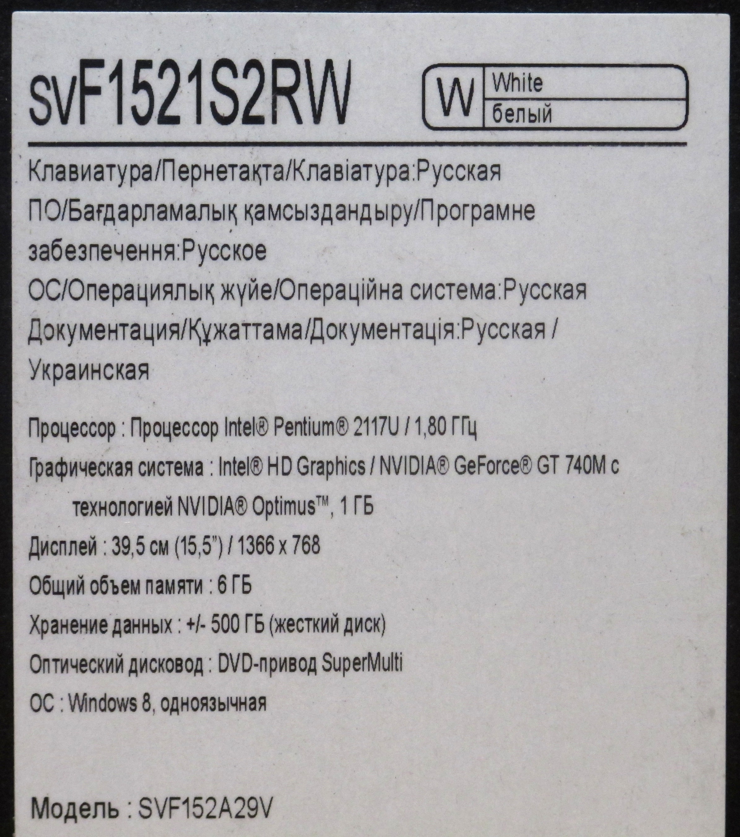 Описание ноутбука Sony SVF-1521S2R/W SVF1521S2RW