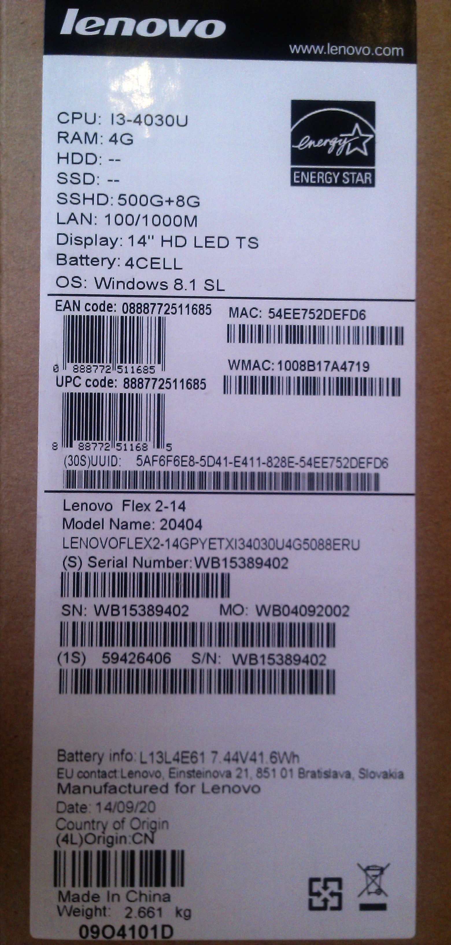 Intel Core i3 1900 MHz (4030U); 4096Mb DDR3L-1600MHz; 8Gb, SSD; 14" LED WXGA (1366x768) TouchScreen Зеркальный; Intel HD Graphics 4400 из ОЗУ; Bluetooth 4.0, Camera (1.0), WiFi (802.11b/g/n); 1xUSB 3.0, 2xUSB 2.0, HDMI, Line-out/Microphone in - combo, Microphone (встроенный); Card Reader 2-в-1 (SD/MMC); 1 год гарантия производителя