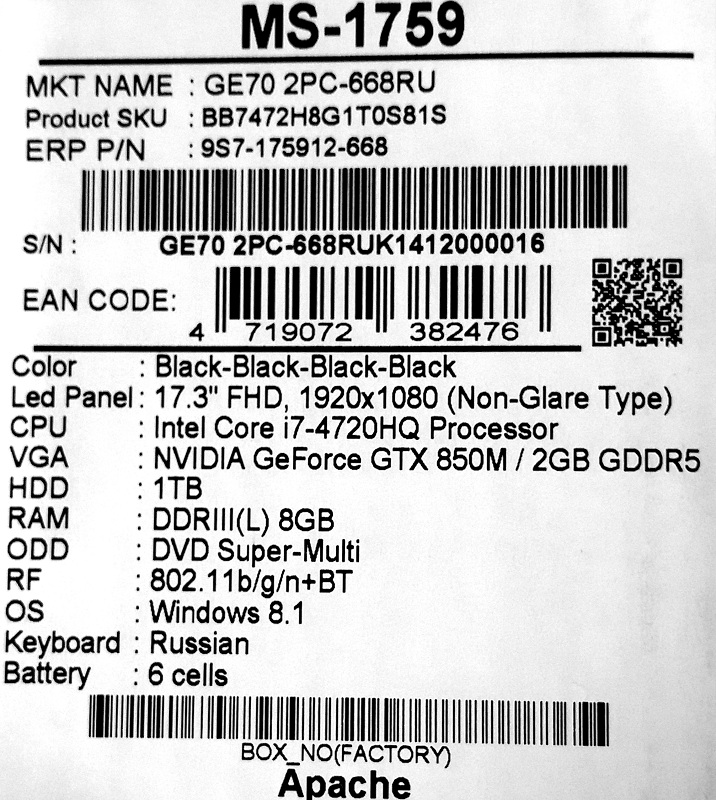 Описание ноутбука MSI GE70 2PC-668RU 9S7-175912-668
