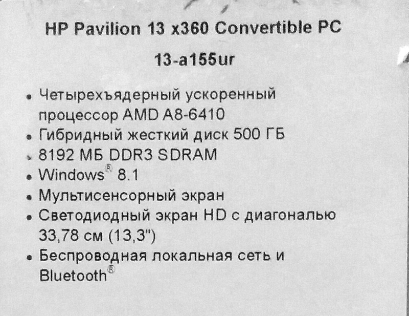 AMD A-Series Quad-Core 2000 MHz (A8-6410); 8192Mb DDR3L-1600MHz; 8Gb, SSD Гибридный; 13.3" LED WXGA (1366x768), TouchScreen Зеркальный, стекло; AMD Radeon R5 из ОЗУ; Bluetooth 4.0, Camera (1.3), WiFi (802.11b/g/n); 1xUSB 2.0, 2xUSB 3.0, HDMI, Line-out/Microphone in - combo, Microphone (встроенный); Card Reader 3-в-1 (SD/SDHC/SDXC); 1 год гарантия производителя