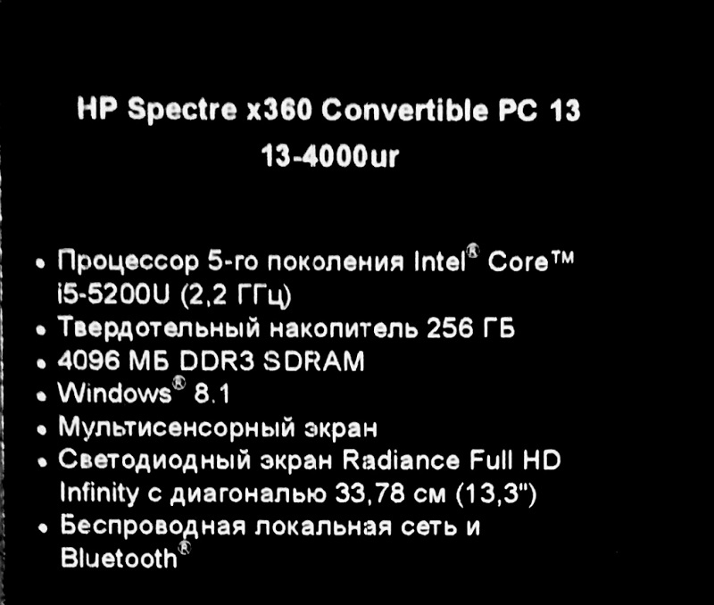 Intel Core i5 2200 MHz (5200U); 4096Mb LPDDR3-1600MHz; 256Gb, M.2, SSD; 13.3" LED (1920x1080) FULL HD, IPS, TouchScreen Зеркальный, стекло; Intel HD Graphics 5500 из ОЗУ; Bluetooth 4.0, Camera HP TrueVision FHD, WiFi (802.11b/g/n); 3xUSB 3.0, HDMI, Line-out/Microphone in - combo, Microphone (встроенный), mini DisplayPort; Card Reader (SD); 1 год гарантия производителя
