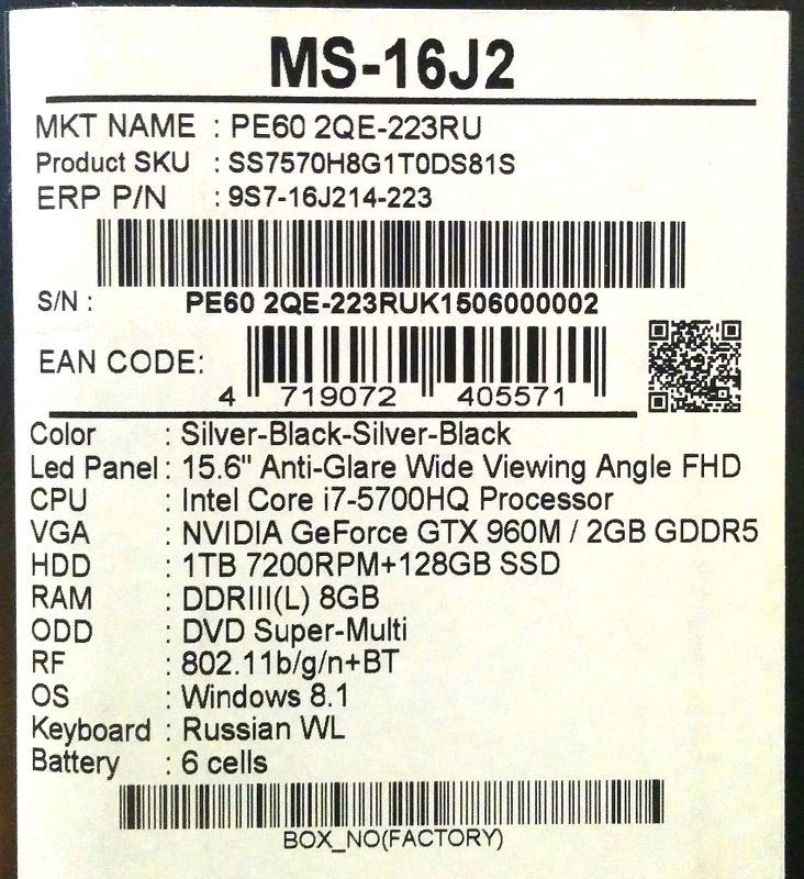 Описание ноутбука MSI PE60 2QE-223RU 9S7-16J214-223