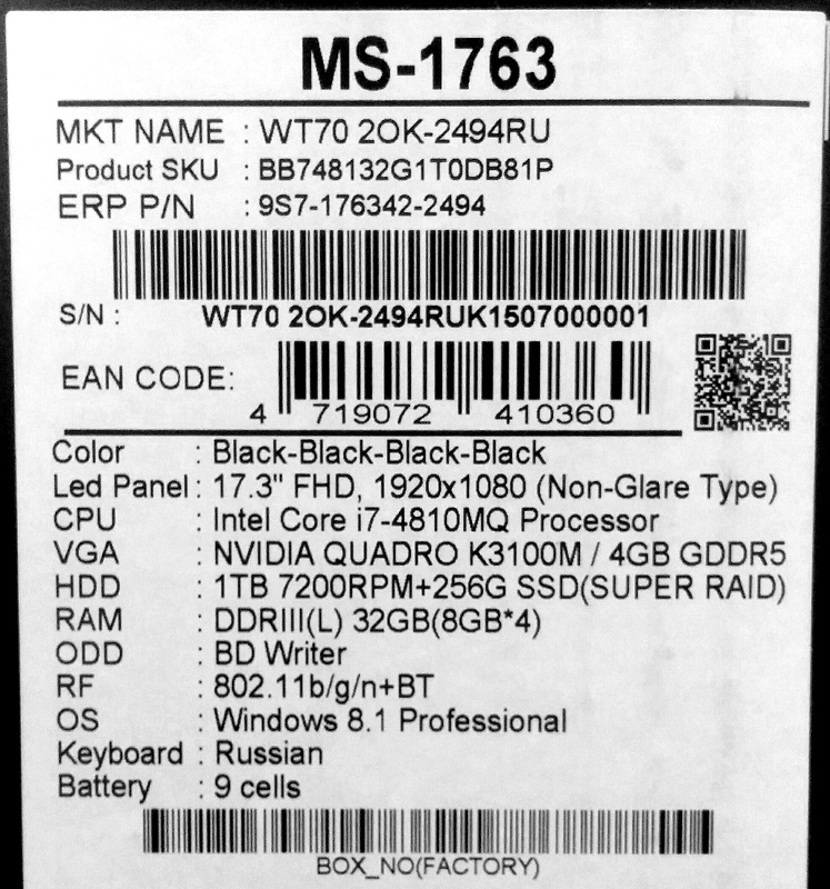 Intel Core i7 2800 MHz (4810MQ); 32768Mb DDR3L-1600MHz; 1000 Gb + 256Gb, SSD; 17.3" LED (1920x1080) FULL HD Матовый; nVidia Quadro K3100M 4096Mb, Intel HD Graphics 4600 из ОЗУ; Bluetooth 4.0, Camera (1.3), WiFi (802.11b/g/n); Microsoft Windows 8.1 Pro 64bit; 2xUSB 2.0, 3xUSB 3.0, HDMI, Line-in, Line-out, Line-out/выход для наушников, Microphone in + 1 встроенный микрофон, VGA, mini DisplayPort; Card Reader 3-в-1 (SD/SDHC/SDXC); 2 года гарантия производителя