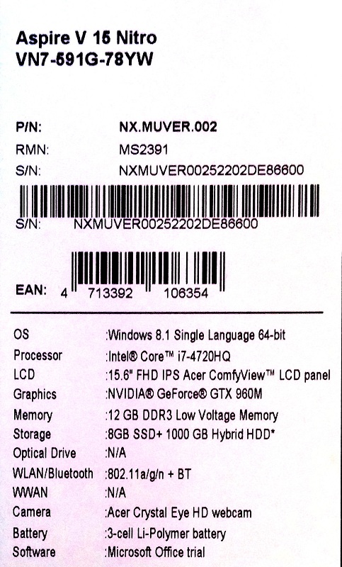 Описание ноутбука Acer Aspire V Nitro VN7-591G-78YW NX.MUVER.002