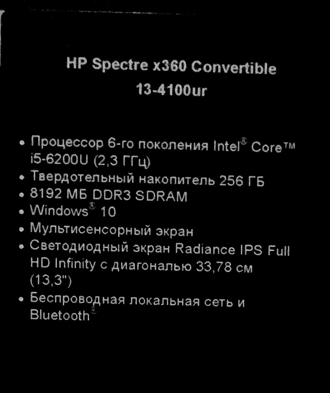 Intel Core i5 2300 MHz (6200U); 8192Mb DDR3L-1600MHz; 256Gb, M.2, SSD; 13.3" LED (1920x1080) FULL HD, IPS, TouchScreen Зеркальный, стекло; Intel HD Graphics 520 из ОЗУ; Bluetooth 4.0, Camera HP TrueVision FHD, WiFi (802.11a/b/g/n/ac) + поддержка Miracast; 3xUSB 3.0 (1 USB с возможностью подзарядки), HDMI, Line-out/Microphone in - combo, Microphone (встроенный) x 2, mini DisplayPort; Card Reader 3-в-1 (SD/SDHC/SDXC); 1 год гарантия производителя