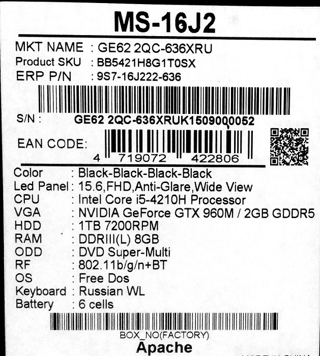Описание ноутбука MSI GE62 2QC-636XRU 9S7-16J222-636