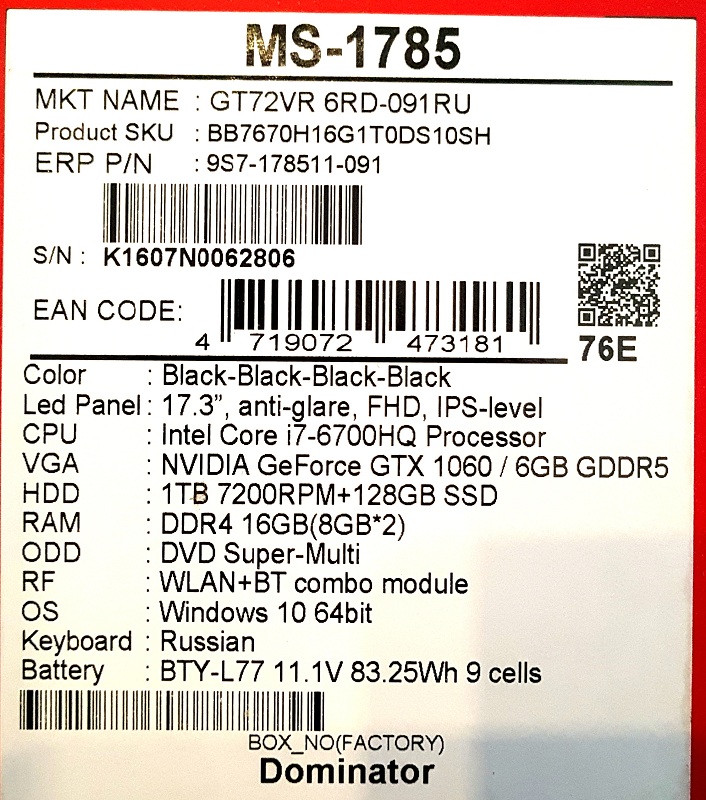 Описание ноутбука MSI GT72VR 6RD-091RU Dominator Pro 9S7-178511-091