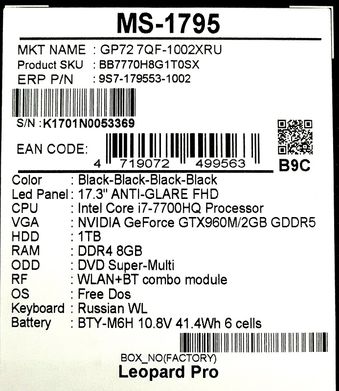 Описание ноутбука MSI GP72 7QF-1002XRU Leopard Pro 9S7-179553-1002