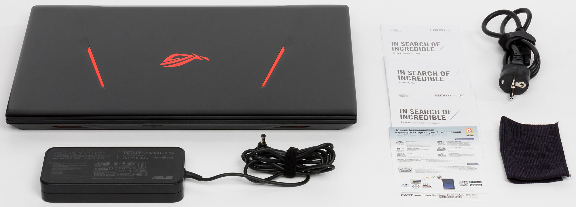 Ноутбук Asus GL753VE – это, возможно, лучший продукт для тех, кто не против поиграть в дороге. Его видеокарта NVIDIA GeForce GTX 1050 Ti обеспечивает запуск последних игр класса AAA даже на высоких настройках. Модель GL753VE – это последователь GL753VD (7700HQ, GTX 1050). В комплектации с ноутбуком предоставляется блок питания и тряпочка из микрофибры (очень нужный в данном случае аксессуар, ведь корпус из алюминия легко собирает отпечатки).