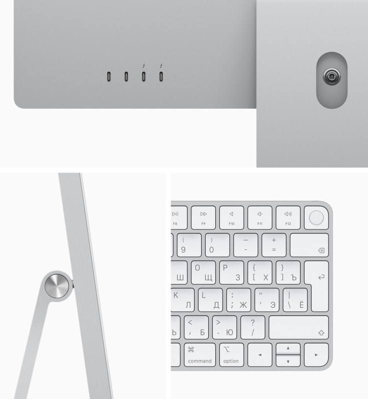 Apple M1 3200 MHz; 16384Mb LPDDR4 (частота не сообщается); 256Gb, PCIe Gen 3, SSD; без ODD; 23,5" (4480x2520), IPS, Retina 4.5K Матовый; Apple M1 8-Core из ОЗУ; Bluetooth 5.0, Camera HD FaceTime 1080 р, WiFi (802.11a/b/g/n/ac/ax); Mac OS; 4xUSB 3.1 Type C (совмещен с DisplayPort / Thunderbolt™3), Combo Line-out/Line-in, Microphone (встроенный); 1 год международная гарантия производителя